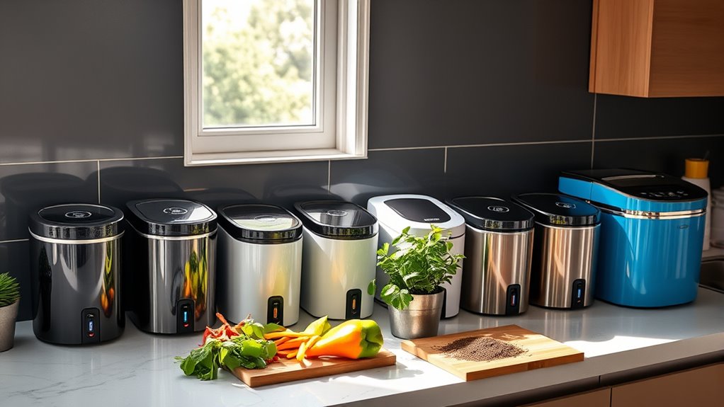 If you’re looking to manage kitchen waste effectively, electric compost bins are a fantastic option. They transform food scraps into nutrient-rich fertilizer in just a few hours while markedly reducing waste. I’ve found models like the 4L Smart Indoor Food Recycler and the Airthereal Revive R500 to be compact, quiet, and user-friendly. Plus, they feature odor control and easy maintenance. Stick around, and I’ll share my top picks that fit perfectly in your kitchen.