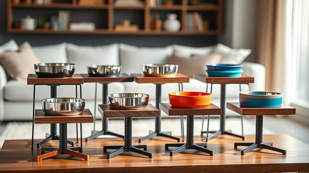 If you’re looking for the best elevated pet bowls with adjustable stands, I suggest choosing options with features like multiple height settings, durable materials such as stainless steel or bamboo, and safety features like non-slip pads. These designs help reduce strain during feeding and offer convenience for different pet sizes and mobility needs. Whether for indoor or outdoor use, these versatile bowls balance comfort and style. Keep exploring to discover top choices that suit your pet perfectly.