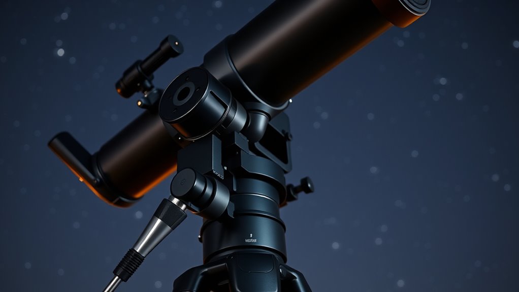 Choosing an equatorial mount with a belt drive system hinges on its ability to deliver exceptional precision and stability. Belt drives reduce gear backlash, allowing for more accurate tracking of celestial objects. Their smooth motion minimizes vibrations, which is crucial for sharp astrophotography images. High-quality systems often feature synchronized dual-axis controls, boosting overall stability and alignment accuracy. The rigidity and tension of the belts are vital; they ensure the mount maintains its position during long observation sessions. Precise manufacturing and high-quality materials in belt drives contribute to consistent, low-latency responses, essential for high-precision astrophotography. When evaluating mounts, prioritize these aspects to ensure your setup can deliver steady, accurate tracking, enabling you to capture detailed, high-quality images of the night sky.