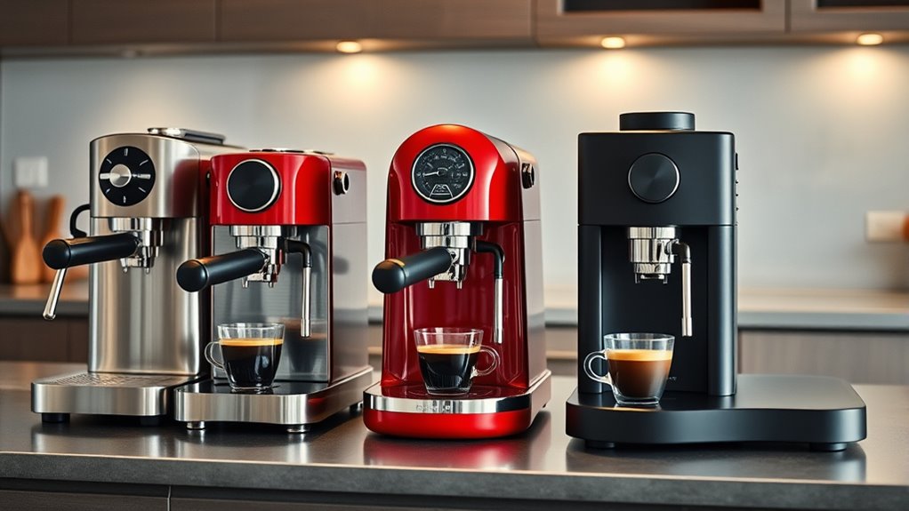 Choosing the right pressure system for your espresso machine can considerably impact your brewing experience, especially as a beginner. The pressure system is mainly determined by the pump, measured in bars, which directly influences extraction. For authentic espresso with that rich crema, you need at least 9 bars of pressure. Many home machines offer 15 to 20 bars, ensuring ideal extraction and flavor. I find it helpful to look for a machine with a pressure gauge; it allows me to monitor and adjust the extraction pressure for consistent results. A reliable pressure system with steady, adjustable pressure is essential as I learn the ropes of brewing, helping me achieve that professional-quality espresso I crave.