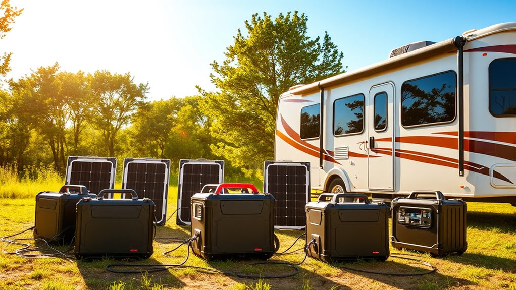 Have you ever considered how weather can unexpectedly impact your RV’s power setup? It’s vital to choose a solar generator kit built for outdoor conditions. Look for weather-resistant enclosures, like IP65-rated waterproof panels and shockproof stations, to handle rain, wind, and dust. Guarantee the batteries and key components are housed in durable, corrosion-resistant casings that withstand moisture and temperature fluctuations. Sealed, waterproof connectors and ports prevent water and debris from compromising the system’s performance. Additionally, protective features such as overheat, short-circuit, and overload protection are essential for reliability in adverse weather. Materials like reinforced plastics or aluminum add extra durability to panels and housings, ensuring your setup remains resilient and functional no matter the weather conditions you encounter on your adventures.