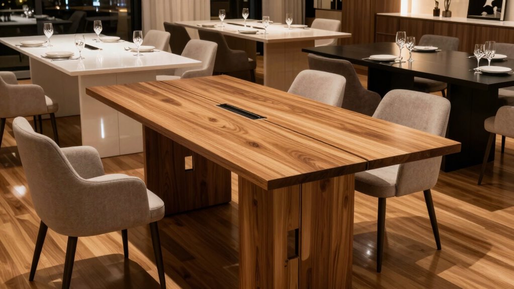 When it comes to long-lasting extendable tables, I swear by solid hardwoods like oak and maple—they’re practically indestructible! Metal frames, especially steel, add serious durability and a sleek look that endures years of gatherings. Veneers and laminates are okay, but they might not stand up to the chaos of hosting forever. Honestly, choosing the right materials feels like investing in a piece that’ll last a lifetime—and then some!