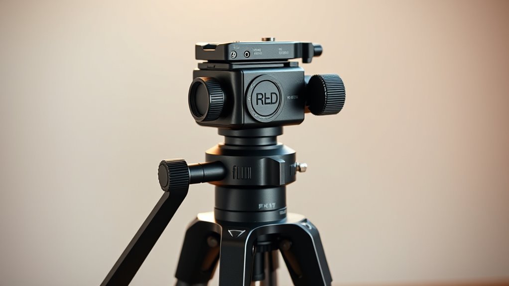 High-quality fluid tripod heads are built from durable materials like aluminum alloy or CNC-machined metal, designed to withstand frequent use and tough outdoor conditions. This robust construction guarantees precise movement control and minimizes gear slippage or backlash during smooth pans and tilts. Strong, corrosion-resistant materials extend the head’s lifespan, especially when used outdoors or in challenging weather. Reinforced joints and sealed components protect internal mechanisms from dust, dirt, and moisture, maintaining consistent performance over time. A well-built head also supports higher load capacities, preventing deformation or damage when supporting heavier camera setups. Overall, investing in a head with excellent build quality guarantees reliable, smooth operation and longevity, making it an essential factor when selecting equipment for professional video work.
