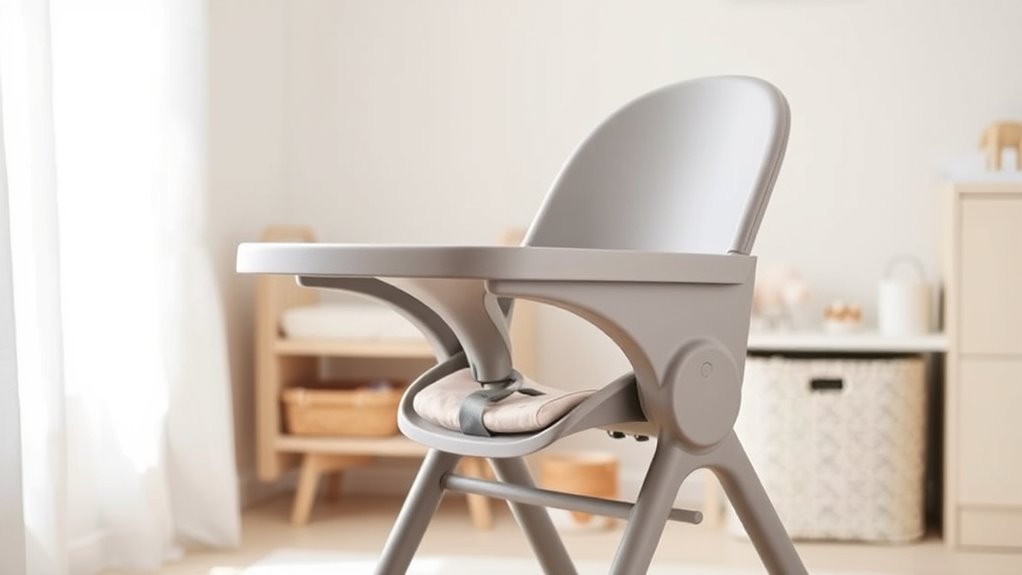 What safety features should I prioritize when selecting a fold-flat high chair for small spaces? First, I look for a secure harness system, like a 3-point or 5-point harness, to keep my child safely seated and prevent falls. Stability is key, so I choose chairs with anti-slip feet or mats that grip various surfaces. I also check that the locking mechanisms are robust and easy to operate, ensuring the chair won’t accidentally fold or collapse. Smooth, rounded edges are essential to avoid injuries, and I prefer models made from non-toxic, BPA-free materials to minimize chemical exposure. Finally, I verify that the chair meets safety standards and certifications, giving me peace of mind that it’s designed with my child’s safety as a top priority.