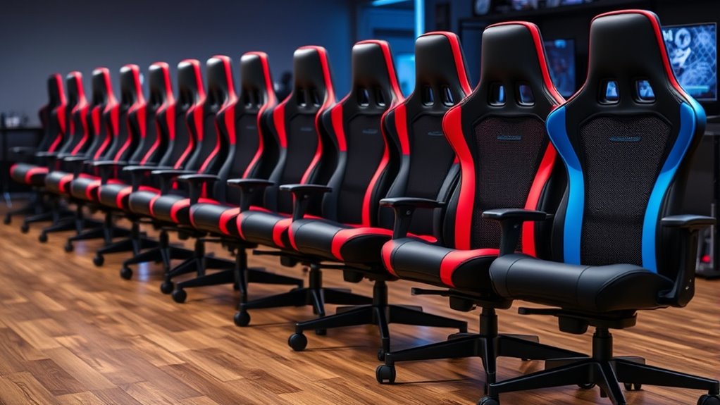 Since comfort is essential for long gaming sessions, paying attention to seat features can make a big difference. A high-density foam cushion is key because it provides firm support and maintains its shape over time, preventing discomfort. The seat’s width and depth should suit different body sizes, ensuring even weight distribution and reducing pressure points. Breathable materials like mesh or perforated leather help prevent heat buildup and sweating, keeping you cool during intense gameplay. An ergonomic or contoured seat design adds extra comfort by reducing strain and pressure on your hips and thighs. Additionally, adjustable seat height and tilt features allow you to customize your position, helping you stay comfortable and focused, even during extended gaming marathons.
