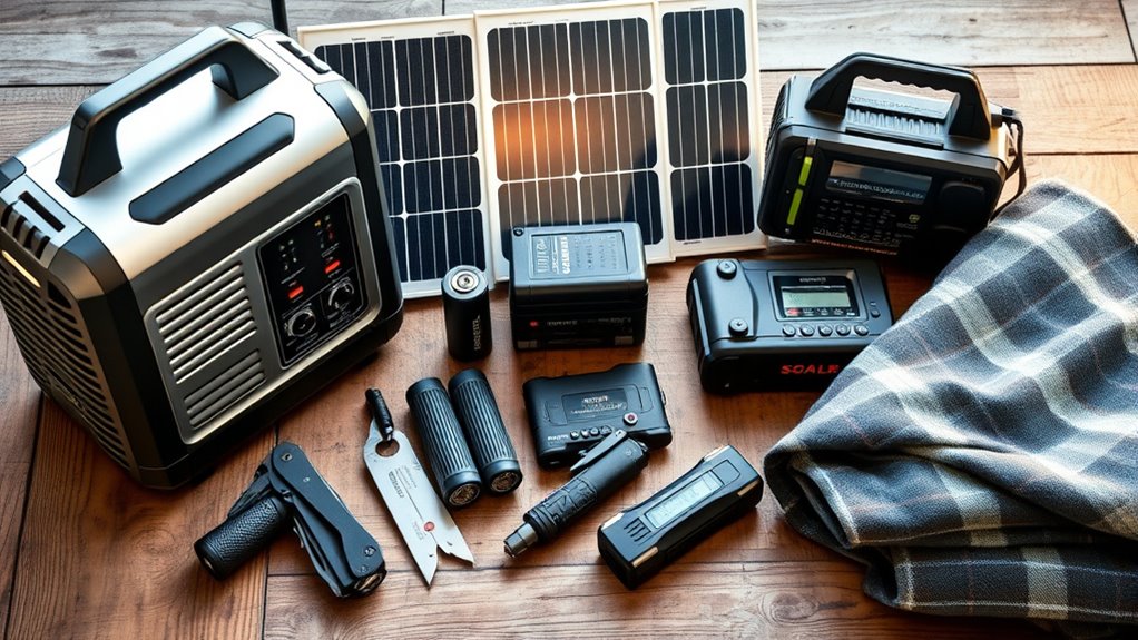 Opting for gear with flexible power sources guarantees you stay prepared during outages, regardless of environmental conditions. Devices that combine solar, hand crank, rechargeable batteries, and USB charging provide reliable options when traditional power isn’t available. These multiple methods allow you to adapt to changing situations, whether it’s sunlight, manual effort, or existing outlets. A high-capacity rechargeable battery—6000mAh or more—ensures extended use of essential devices without frequent recharging. Quick recharging via USB or solar panels minimizes downtime, keeping your gear operational longer. Flexibility in power sources enhances resilience, offering backup options if one method fails or becomes inaccessible. By choosing gear with versatile power options, you ensure continuous operation and peace of mind during power outages in 2025.