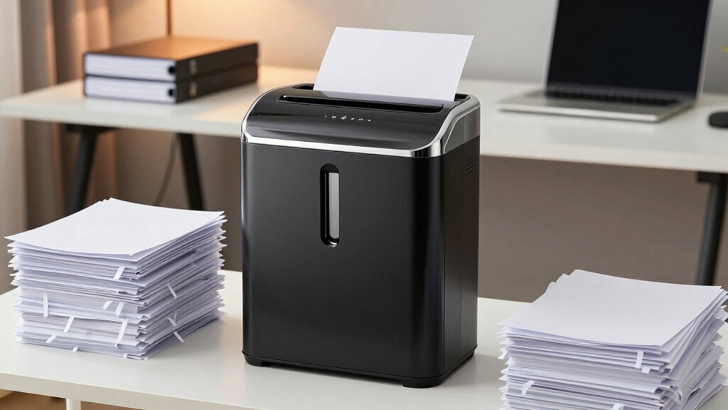 Choosing the right heavy-duty paper shredder for your home hinges on understanding its shredding capacity and speed. Shredding capacity indicates how many sheets a shredder can handle per pass, usually between 8 and 110 sheets for heavy-duty models. A higher capacity means you can shred larger stacks at once, saving time. Shredding speed, measured in inches per minute, affects how quickly you can clear large volumes of documents. Faster shredders make the process more efficient, especially if you frequently dispose of sensitive information. Keep in mind that continuous use can lead to overheating, so selecting a shredder with appropriate cycle times and cooling features is essential. Opting for a model with high sheets-per-pass capacity and speed ensures quicker, more effective document destruction.