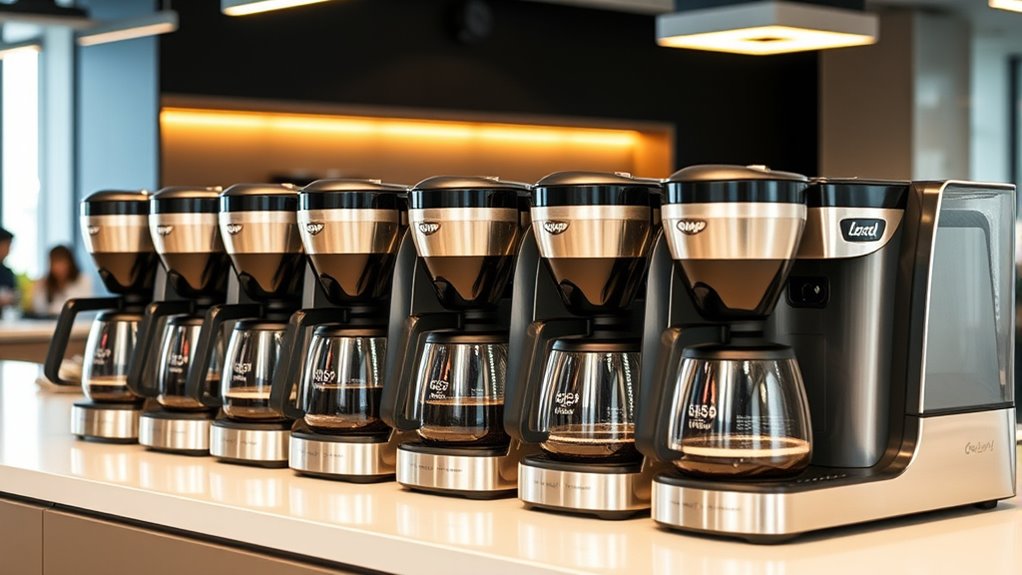 Maximizing efficiency in a busy office hinges on how quickly and reliably your coffee maker can brew large quantities. High-capacity drip coffee makers can produce multiple cups in just 2 to 4 minutes, keeping up with high demand. This speed is often boosted by multi-stream spray heads that evenly distribute hot water over the coffee grounds, speeding up extraction. Large water reservoirs that refill quickly enable continuous brewing without frequent pauses, saving time during busy periods. Additionally, commercial-grade heating elements ensure the water reaches and maintains ideal brewing temperatures swiftly, reducing wait times. A rapid brewing cycle is essential for offices to serve everyone promptly without sacrificing coffee quality or causing delays. Quick, efficient brewing keeps everyone energized and productivity high.