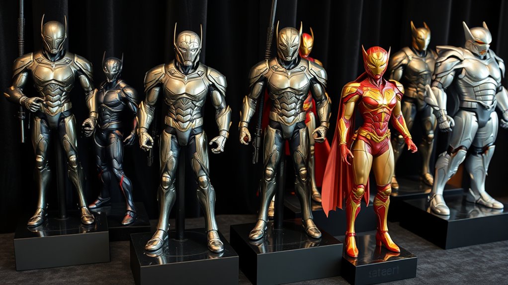 Limited edition action figures stand out because their restricted quantities make them highly sought after by collectors. The scarcity often boosts their desirability and potential resale value over time. These collectibles usually feature unique designs, special packaging, or exclusive accessories not found in standard releases, adding to their appeal. Authentic limited editions typically come with certificates of authenticity or serial numbers, verifying their rarity and helping to confirm their value. The limited production run also enhances their prestige, creating a sense of urgency among buyers to purchase before they sell out. When choosing high-end action figures, considering their limited edition status can considerably impact your investment, ensuring you acquire a piece that’s both rare and potentially more valuable down the line.