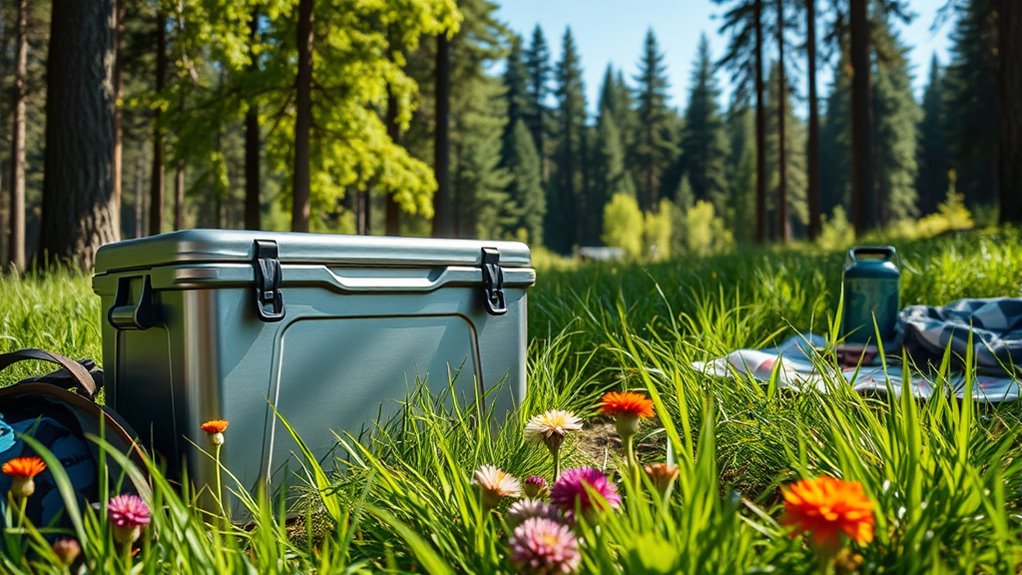 Portability and convenience are vital factors that can make or break your camping experience. When choosing a high-end cooler, I focus on its weight and handle design to guarantee easy carrying, especially for long hikes or extended outings. Features like telescoping or large-grip handles help with one-handed or multi-person transport. Wheels and a sturdy telescoping handle are game-changers for moving the cooler over rough terrain effortlessly. Some coolers also include shoulder straps or additional carry handles, adding versatility in different outdoor settings. Balancing size and weight with capacity is essential—you want something large enough to meet your needs but lightweight enough to transport comfortably. Prioritizing these features ensures your cooler enhances convenience without adding unnecessary hassle.