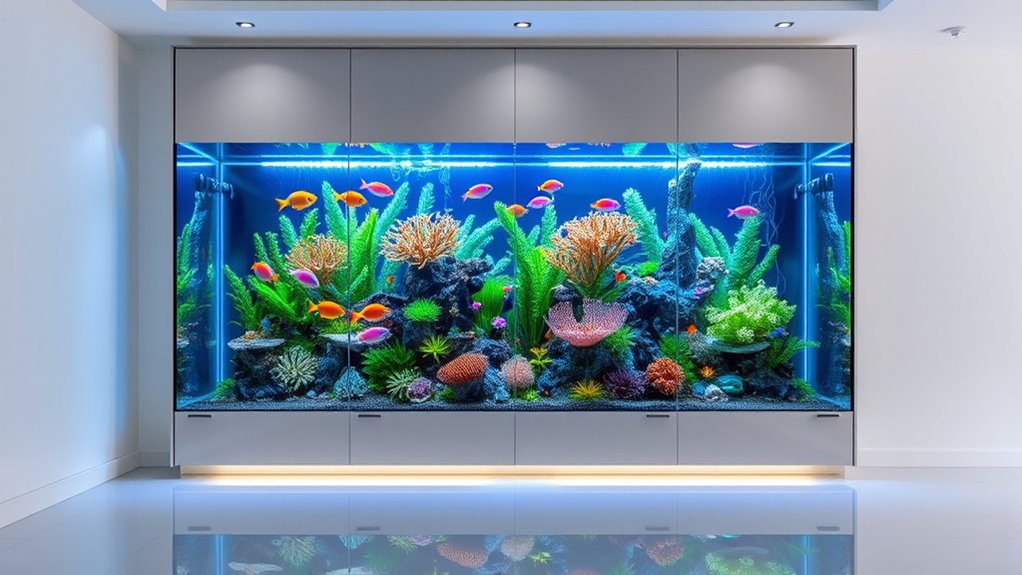 A high-end fish aquarium’s visual appeal and overall health depend heavily on its filtration system. Advanced multi-stage filters combine mechanical, biological, and chemical processes to maintain pristine water quality. These systems often feature large media chambers that maximize contact time and filtration surface area, guaranteeing efficient toxin removal and beneficial bacteria growth. Quiet, energy-efficient pumps with adjustable flow rates promote proper circulation without stressing the aquatic life. Specialized media like bio-foam, ceramic rings, and activated carbon further enhance filtration by trapping debris and removing harmful substances. Regular maintenance is vital to sustain water clarity, reduce nitrates, and keep the environment healthy for diverse species. Investing in a top-tier filtration system ensures your aquarium remains both stunning and thriving.
