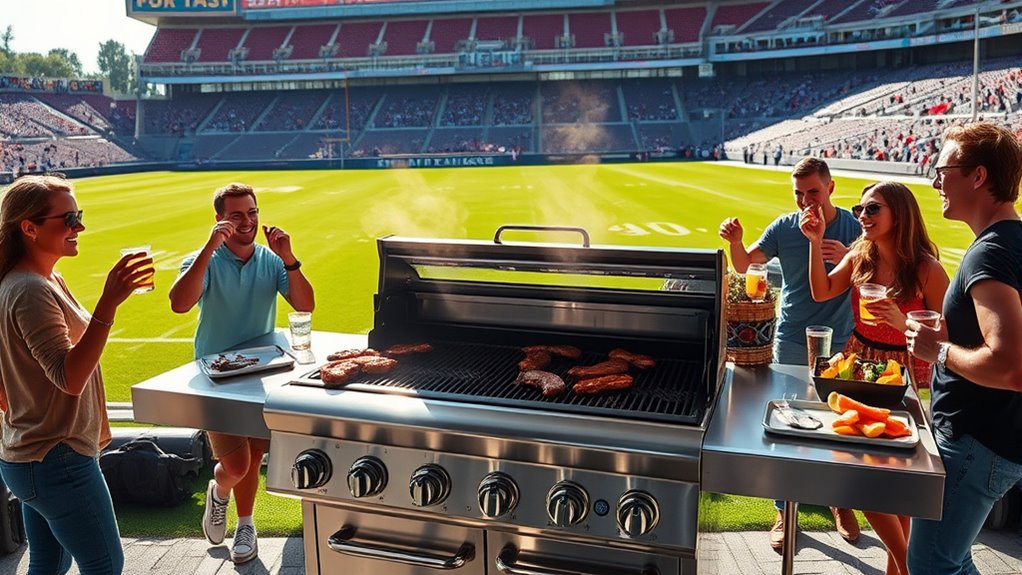I find that quality accessories really boost my grill’s performance at tailgates. A digital thermometer helps me nail perfect doneness, while a rotisserie kit adds versatility for roasting. Heavy-duty grill mats protect the surface and make cleanup easy. I also recommend high-quality tongs and spatulas for better control, and a durable cover to shield my investment from the elements. These add-ons make my grilling experience more efficient and enjoyable.