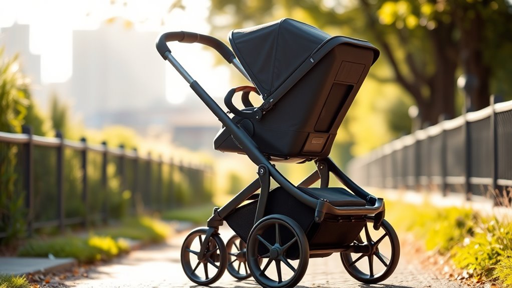 Choosing a high-end jogging stroller means prioritizing durability and quality materials that can handle frequent, active use. These strollers are built with lightweight aluminum frames and high-impact polymers, ensuring they withstand rigorous activity without weighing you down. The fabrics are weather-resistant, UPF 50+ rated, and easy to clean, offering protection from sun, rain, and dirt while lasting over time. Pneumatic, air-filled tires made from premium rubber or foam provide a smooth ride and resist punctures, even on rough terrain. Reinforced joints and high-strength fasteners enhance safety and longevity, so you can trust the stroller to hold up through regular adventures. Precision welding and thorough material testing further guarantee structural integrity, making these strollers reliable companions for active parents.