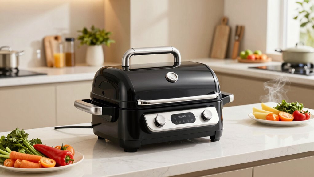 Did you know that most indoor smokeless grills emit minimal to no harmful fumes? I’ve found that these grills are designed with advanced ventilation and filtration systems, which considerably reduce smoke and fumes during operation. I feel safe using mine regularly because it’s built to minimize airborne pollutants. So, if you’re concerned about fumes, rest assured these grills are a healthier choice for indoor cooking.