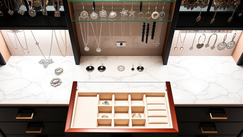 Have you ever struggled to find the right piece because your jewelry organizer lacks clear compartments? A well-designed layout makes all the difference. Look for organizers with designated sections for rings, earrings, necklaces, and bracelets; this prevents clutter and makes items easier to locate. Adjustable or removable dividers are excellent because they let you customize the space to fit jewelry of different sizes and shapes. Features like hooks, loops, and trays specifically for hanging or laying flat jewelry help keep everything orderly and minimize tangling or damage. Clear visibility is also key—see-through pockets or open compartments let you quickly spot your favorite pieces. Ultimately, a smart layout maximizes space while maintaining easy access, ensuring your jewelry stays organized and looking fabulous.
