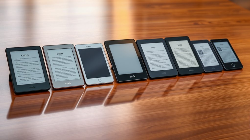 Display technology features play a crucial role in guaranteeing a comfortable and enjoyable reading experience, especially when exploring alternatives to the Kindle Oasis. The resolution, screen size, and grayscale levels directly impact how sharp and clear the text appears, making reading easier on the eyes. Next-generation e-ink screens offer faster page turns and less ghosting, which boosts overall comfort. Adjustable warm light and color-shifting screens help reduce eye strain during long reading sessions, while waterproof and glare-resistant displays allow for versatile use in various lighting conditions and environments. Additionally, features like landscape orientation and rotation capabilities can enhance ergonomics and accessibility. Paying attention to these display aspects ensures you select a device that offers not just good looks but also top-tier reading comfort.