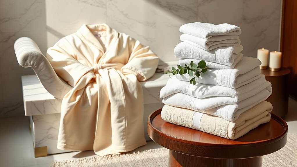 I recommend choosing fabrics like Turkish cotton, Egyptian cotton, or bamboo because they’re both durable and incredibly soft. Turkish and Egyptian cotton are known for their long fibers, which make towels and robes plush yet long-lasting. Bamboo offers a silky feel and resists wear over time. I personally love these options for their balance of durability and luxurious softness, making your spa experience even more indulgent.