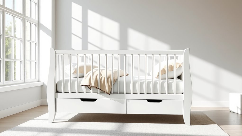 Luxury convertible cribs often feature adjustable mattress heights, ensuring safety as your baby grows. They include sturdy, non-toxic materials and slat spacing that meets safety standards to prevent entrapment. Many also have secure, easy-to-use conversion mechanisms to transform the crib into a toddler bed without risking stability. I always look for cribs with smooth, rounded edges and reinforced joints to keep my little one safe and comfortable.
