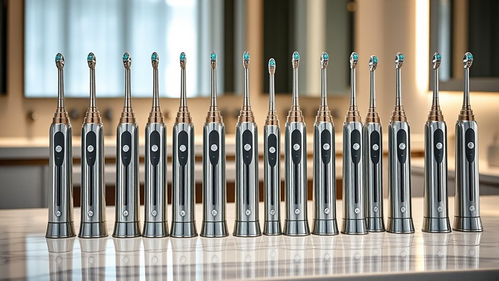 Tip versatility is a key feature that elevates the functionality of luxury water flossers, allowing you to customize your cleaning experience. Many high-end models come with multiple interchangeable tips, such as orthodontic, plaque seeker, tongue cleaner, and periodontal tips, to target specific needs. This variety enables more thorough cleaning of hard-to-reach areas, braces, implants, and gums, with adjustable water jet intensities and angles. Having a range of tips stored in organized cases or holders makes switching seamless during a session. Using specialized tips not only enhances plaque removal and gum stimulation but also helps maintain fresh breath. Overall, tip versatility guarantees you can tailor your oral hygiene routine for maximum effectiveness, making your water flosser a versatile, indispensable part of your daily dental care.
