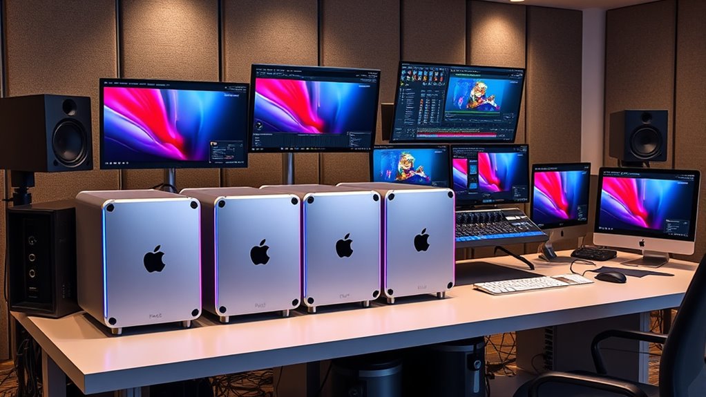 In 2025, choosing the right Mac Pro feels like selecting the finest chariot for a grand parade—speed, power, and reliability matter. Whether you’re editing a blockbuster or crafting a masterpiece, these top models deliver unmatched performance. Trust me, these Macs will handle your post-production workload effortlessly, making you feel like you’ve stepped into a future where technology and creativity collide seamlessly. It’s like having a trusty steed in a digital Renaissance—ready for anything.