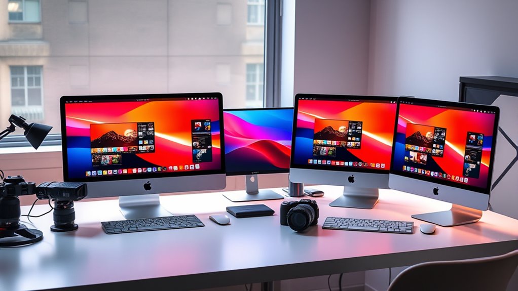 To get the most out of your Mac Studio for photography workflows, it’s important to guarantee that the device supports your display setup. Confirm your Mac Studio can handle the resolution and refresh rate you need, such as 6K or 8K displays via Thunderbolt or HDMI. Check that it has compatible ports like Thunderbolt 4 or USB-C to connect your high-resolution monitors seamlessly. If you work with HDR content, verify support for formats like Dolby Vision to enhance your editing precision. Consider how many displays you plan to use simultaneously, especially if working with multiple high-res screens. Finally, assess the GPU’s performance to ensure smooth rendering and editing across your chosen display configurations, avoiding lag or bottlenecks during intensive tasks.