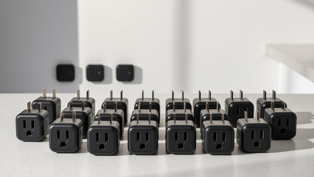 Control and automation features play a crucial role in getting the most out of your Matter-compatible smart plug multi-packs. These features allow you to schedule devices to turn on or off automatically, saving energy and enhancing convenience. Many smart plugs support timers, so you can set routines without manual intervention. Remote operation via mobile apps or voice commands adds flexibility, letting you control devices from anywhere. Integration with multiple smart home ecosystems like Apple Home, Alexa, Google, and SmartThings ensures seamless control through your preferred platform. Advanced models offer energy monitoring, enabling routines based on power consumption for better energy efficiency. Additionally, creating device groups and scene automations allows synchronized control across multiple plugs, elevating your home automation experience.