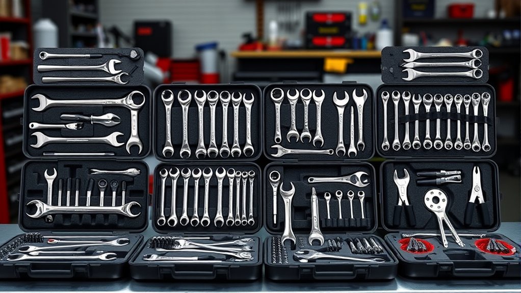 A well-rounded mechanic tool set must include a variety of socket sizes, typically from 4mm to 32mm or 1/8 inch to 1 1/4 inch, to handle different fasteners. It’s crucial to have multiple drive sizes like 1/4″, 3/8″, and 1/2″ to suit various tasks and fastener types. Including both metric and SAE tools guarantees versatility across different mechanical applications. Look for sets that feature deep and shallow sockets, allowing access to fasteners in tight or recessed spaces. Additionally, a good set should contain various wrenches, ratchets, extensions, and specialty bits to cover a broad range of repair and maintenance needs. This variety not only increases efficiency but also ensures you’re prepared for virtually any job.