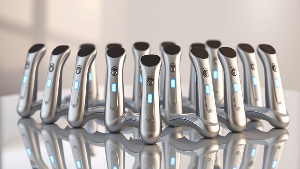 When evaluating microcurrent facial toning devices, portability and design play crucial roles in guaranteeing convenience and ease of use. A compact, lightweight design makes handling simple and allows me to incorporate treatments into my daily routine effortlessly. Ergonomic shapes that fit facial contours improve comfort and treatment accuracy, making sessions more effective. Devices with rechargeable batteries offer the freedom to use them anywhere—no cords or outlets needed—perfect for on-the-go skincare. Travel-friendly features like small size and included cases make it easy to carry devices during trips or commutes. A sleek, modern look not only enhances aesthetic appeal but also encourages consistent use, seamlessly fitting into my personal skincare setup. Prioritizing these factors ensures a user-friendly experience without sacrificing style or convenience.