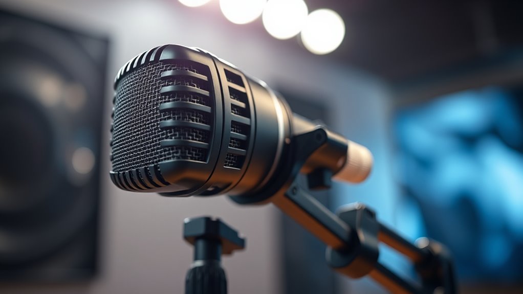 Choosing the right microphone for podcasting in 2025 hinges on understanding key sound quality standards that guarantee professional results. A wide frequency response, typically from 20 Hz to 20 kHz, ensures you capture the full vocal spectrum accurately. A high signal-to-noise ratio, around 78 dB or more, minimizes background noise, resulting in clearer recordings. Cardioid or unidirectional polar patterns are preferred because they focus on your voice and cut out ambient sounds. Features like internal pop filters and shock mounts help reduce plosive sounds and vibrations, enhancing clarity. Additionally, microphones that handle high SPL levels, such as 130 dB, can record loud sources without distortion. Meeting these standards is essential for achieving studio-quality sound in your podcast.