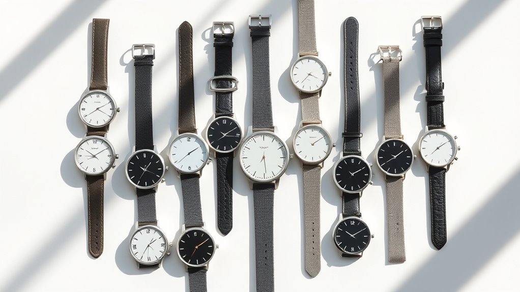 Most minimalist watches under $300 feature leather, stainless steel, or silicone straps. Leather straps are classic and versatile, perfect for both casual and formal wear. Stainless steel bracelets offer durability and a modern look, while silicone straps provide comfort and sportiness. I find that leather and stainless steel are the most common, giving a sleek, timeless appeal that complements minimalistic designs without overspending.