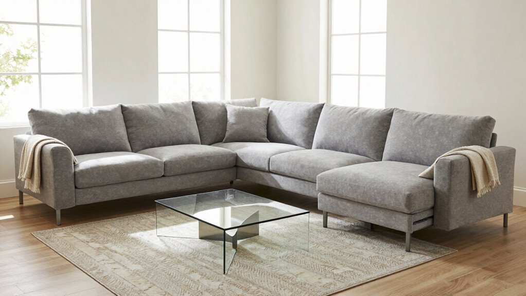 Ease of assembly is a crucial factor to contemplate because it directly impacts how quickly and easily your family can set up or modify your sofa. Modular sectional sofas with snap-in or click-together parts usually require minimal tools and can be assembled within 30 to 60 minutes, making setup straightforward. Sofas built with lightweight, pre-connected modules are especially user-friendly, allowing one person to handle the assembly with less effort. Clear, detailed instructions and included tools further simplify the process, reducing frustration. Features like no-tool assembly, modular reconfiguration, and pre-assembled sections cut down on time and effort. Choosing a sofa with fewer parts and simple connections makes the entire setup more manageable, especially for busy families seeking convenience and flexibility.