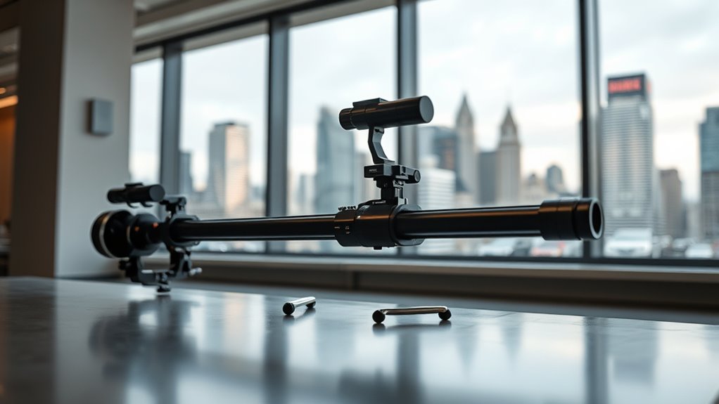 Choosing a motorized camera slider with versatile angle support can substantially enhance your B-roll footage. It allows smooth shifts between horizontal, vertical, and diagonal shots, giving your footage a dynamic edge. Adjustable angles like 45° tilt or vertical orientation open up creative possibilities for capturing unique perspectives. The ability to program precise movements at different angles ensures consistent, professional results across various shot types. Features such as multiple mounting points and adjustable legs help maintain stability and accurate positioning, even at challenging angles. Supporting diverse modes—tracking, panoramas, and time-lapses—requires a slider that can seamlessly adapt to different angles, making your filming more flexible and efficient. Overall, versatility in angles greatly broadens your creative scope and improves footage quality.