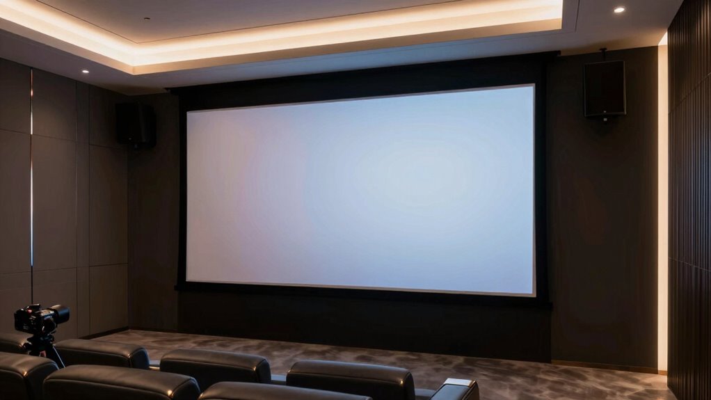 Imagine your home theater as a symphony, where all devices harmonize perfectly. Yes, motorized projector screens can be integrated with smart home systems. I’ve set mine up to open at the press of a button or voice command, making the experience seamless. Most modern screens support smart home compatibility through Wi-Fi or hubs like Alexa or Google Assistant, bringing convenience and a touch of magic to movie nights.