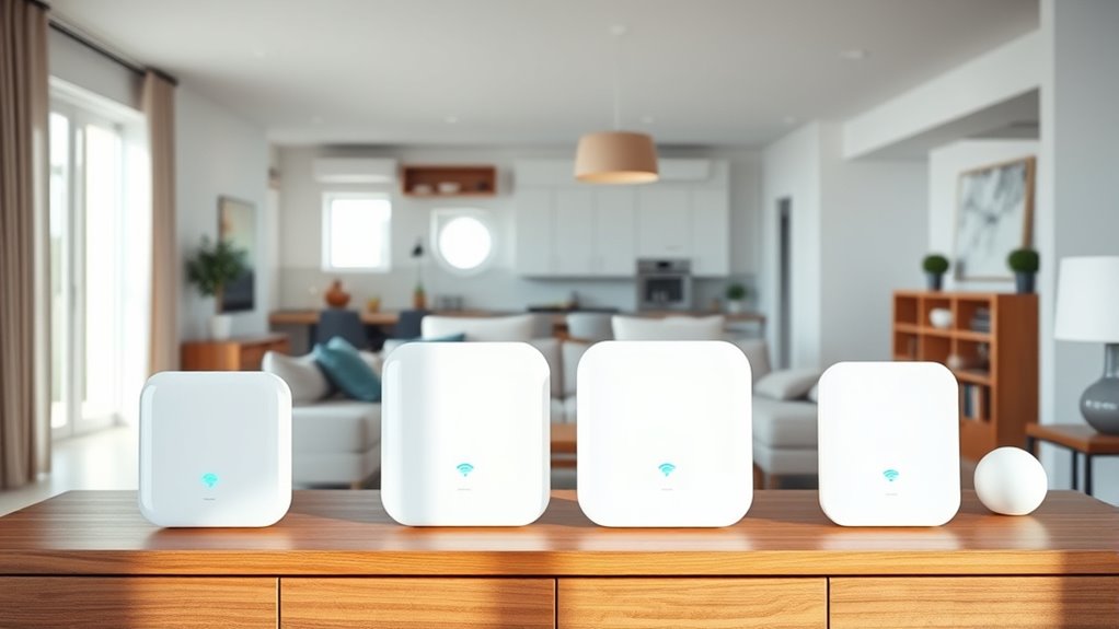 Imagine a seamless web of strong, fast Wi-Fi threads weaving through your home, effortlessly connecting every device. With the right multi-room mesh system, you’ll enjoy smooth streaming, quick downloads, and reliable coverage from basement to attic. Whether you choose the sleek tri-band or robust Wi-Fi 7 options, you’ll create a digital sanctuary where connectivity flows as effortlessly as sunlight through your windows. It’s more than tech—it’s the foundation for your connected life.