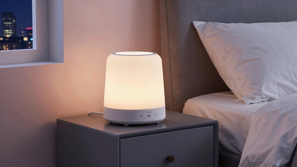 Noise machines improve my sleep quality by creating a consistent, soothing sound environment that masks disruptive noises. They help me relax faster and stay asleep longer by reducing sudden sounds that wake me up. I find the gentle white noise or nature sounds calming, making it easier to fall asleep and maintain deep rest throughout the night. Overall, they provide a peaceful atmosphere that markedly enhances my sleep experience.