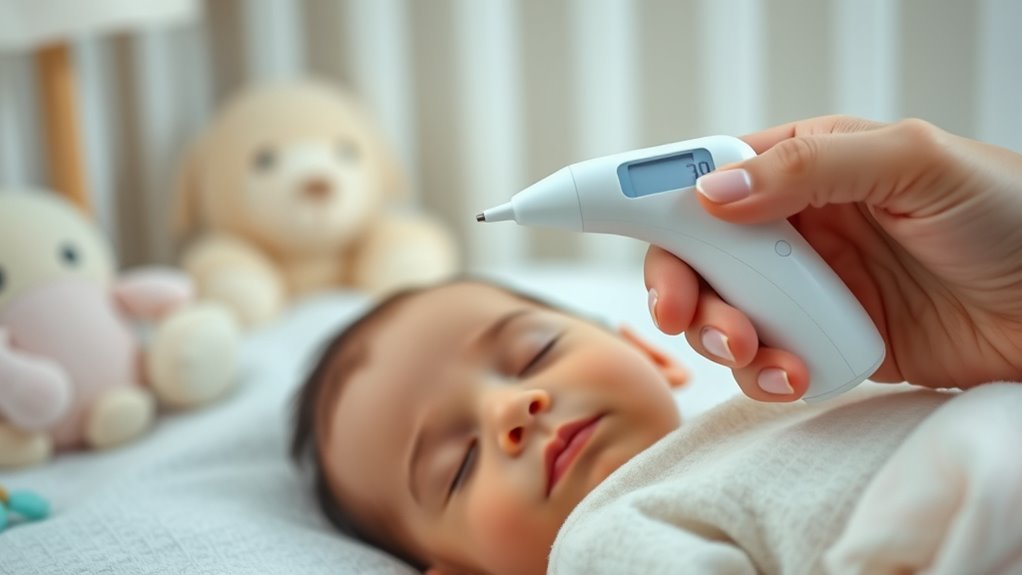 I recommend calibrating your non-contact thermometer at least once every year to guarantee accuracy. You should also replace it if you notice inconsistent readings or if it’s dropped or damaged. Regular cleaning is essential to keep it functioning properly. If you’re unsure, check the manufacturer’s guidelines, as some models might have specific calibration or replacement recommendations. Staying vigilant helps keep your baby’s health monitoring reliable.