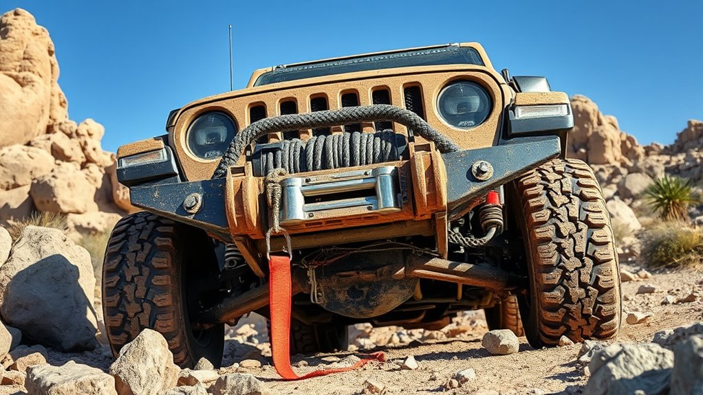 Ensuring your off-road winch is waterproof and weatherproof is vital for reliable performance in tough conditions. A good waterproof winch typically has an IP67 or IP68 rating, meaning it’s protected against dust and capable of handling water immersion, perfect for water crossings and muddy trails. Weatherproof winches feature sealed electrical components and corrosion-resistant finishes, shielding them from rain, snow, and humidity. This protection helps prevent electrical failures and extends the lifespan of your equipment. Additionally, synthetic ropes, less affected by moisture and corrosion than steel cables, improve durability in wet environments. Regular maintenance, like checking seals and applying protective coatings, is essential to keep the waterproof integrity intact over time. Choosing a winch with these features ensures dependable operation when the terrain gets tough.