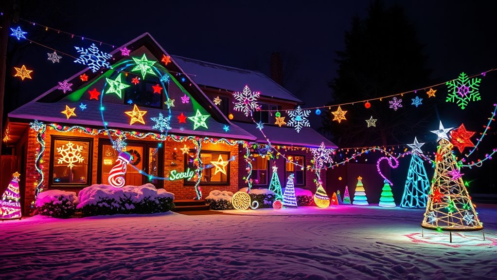 If you’re looking to brighten up your holidays, I recommend checking out the top outdoor Christmas light projectors. These include laser lights, snowflake projectors, and RGBW options that cover large areas with vivid effects. Many models are weatherproof, easy to install, and offer remote controls for convenience. With features like multiple patterns, adjustable speeds, and smart home compatibility, you can create stunning displays effortlessly. Keep scrolling to discover all the fantastic options and find your perfect festive projector.