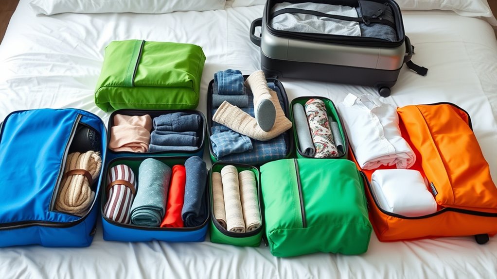 Think of your packing cubes as loyal travelers who need care to stay effective. I clean mine with a damp cloth and mild soap, avoiding harsh chemicals, and air them out after use. To maintain them, I store them in a cool, dry place and avoid overstuffing. Proper cleaning and gentle handling keep my cubes durable, ensuring they serve me well on every adventure.