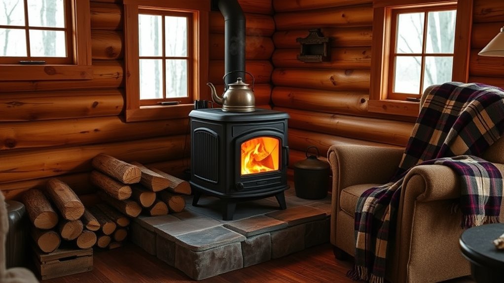Have you considered how the size of your off-grid cabin impacts the heating capacity you need? Pellet stoves vary in their heating range, typically from 800 sq ft to over 3,000 sq ft. Choosing a stove with the right capacity guarantees your space stays warm without wasting energy. Larger stoves with higher BTU outputs are perfect for big, open-plan cabins or colder climates, providing consistent heat across multiple rooms. Conversely, smaller stoves are more energy-efficient for compact cabins but might struggle to heat larger or multi-room spaces effectively. Matching the stove’s capacity to your cabin’s square footage is vital for comfort and efficiency. Proper sizing prevents under-heating or overworking your stove, helping you stay cozy off the grid without unnecessary fuel consumption.