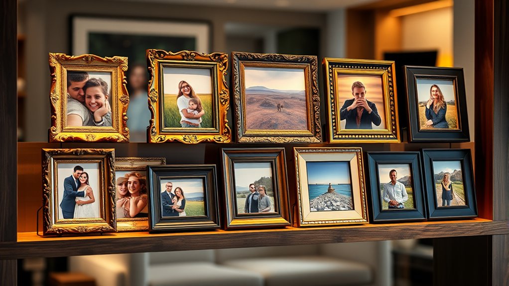 I recommend choosing materials like solid wood or metal for durability. These materials resist damage and stand the test of time, making your memories last longer. Avoid flimsy plastics, which can crack or warp easily. I also consider the frame’s finish—smooth, sealed coatings protect against moisture and scratches. Ultimately, pick a sturdy material that complements your decor while ensuring your photo stays safe and beautiful for years.