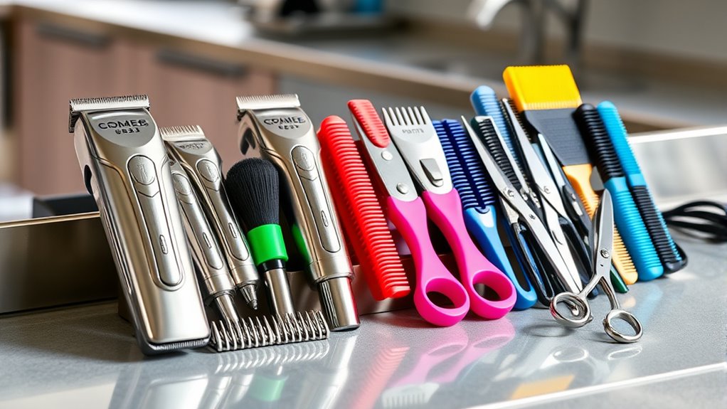 Choosing the right pet grooming kit with clippers depends on several important factors to guarantee safe and effective grooming. First, ensure the kit includes adjustable blades or guide combs suited for your pet’s coat length and type. This helps you achieve a smooth, even cut without irritating sensitive skin. Low noise levels—under 55 dB—are crucial to reduce pet anxiety during grooming sessions. Cordless and rechargeable options offer better mobility, making it easier to groom pets of various sizes and in different areas. Additionally, verify that the blades are made of sharp, durable materials like stainless steel or titanium for efficient trimming. Safety features such as rounded blades or guards are vital to prevent injuries, especially around sensitive areas. These factors help guarantee your pet’s comfort and safety during grooming.