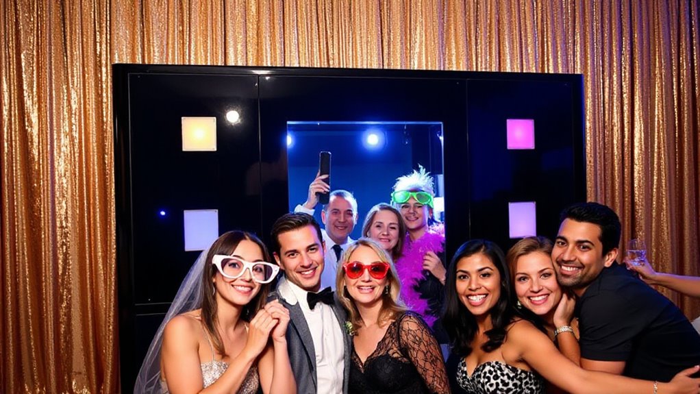 Think of modern photo booths as guardians at your party’s gate, equipped with safety features that keep everyone secure. They include sturdy enclosures to prevent falls, anti-slip mats to avoid slips, and rounded edges to prevent injuries. Many also feature automatic shut-off systems and secure electrical wiring, ensuring safety isn’t just an afterthought but a built-in promise. I feel confident knowing these booths prioritize your guests’ well-being while capturing unforgettable moments.