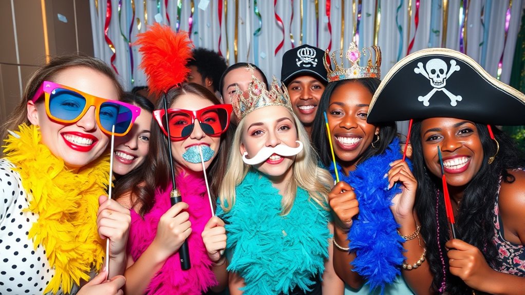 If you want to make your parties truly unforgettable, I recommend exploring a variety of fun photo booth props. From colorful tropical sets, funny glasses, and custom big heads to inflatable instruments and themed selfie frames, there’s something to suit every celebration. These props boost creativity, add humor, and capture picture-perfect moments. Keep going, and you’ll discover essential tips and options to choose the best props that match your event and guests’ enjoyment.