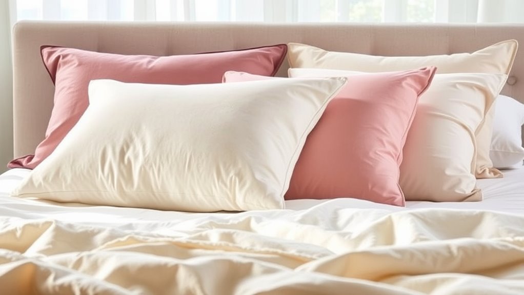 Imagine a shield protecting you from allergens—that’s what specific pillow materials can do. For allergy-prone side sleepers, I recommend hypoallergenic covers, memory foam, or latex. These materials resist dust mites and mold, creating a barrier between you and irritants. I personally find natural latex to be breathable and hypoallergenic, offering comfort and peace of mind. Choosing the right material helps me breathe easier and sleep more soundly.