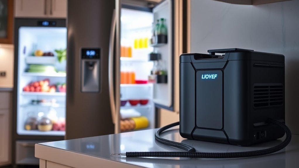 Looking for the best plug-and-play batteries to keep your refrigerator running in emergencies or off-grid? I recommend options like the Lipower 1120Wh power station and removable lithium batteries compatible with Alpicool models, which offer reliable backup, quick charging, and safety features. Accessories like car converter cables and LED bulbs also help boost convenience. Keep in mind factors like capacity, portability, and safety. Stay tuned for detailed insights to help you choose the perfect backup solution.