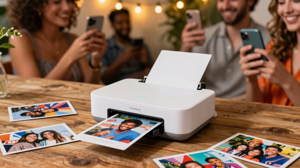 Wireless connectivity options play a crucial role in selecting a portable photo printer for parties, as they determine how easily you can print photos from your devices. Bluetooth is great for quick, on-the-spot printing, thanks to its instant pairing feature, making it perfect for spontaneous moments. Wi-Fi connectivity lets multiple devices connect simultaneously, enabling printing from social media apps and cloud storage—ideal when guests want to print their favorite shots. NFC offers tap-to-print functionality, providing a contactless, hassle-free experience for compatible smartphones and tablets. Some printers even include built-in hotspots, allowing direct device connections without relying on external Wi-Fi networks. This versatility ensures seamless printing during lively parties, making connectivity options a key factor to contemplate.