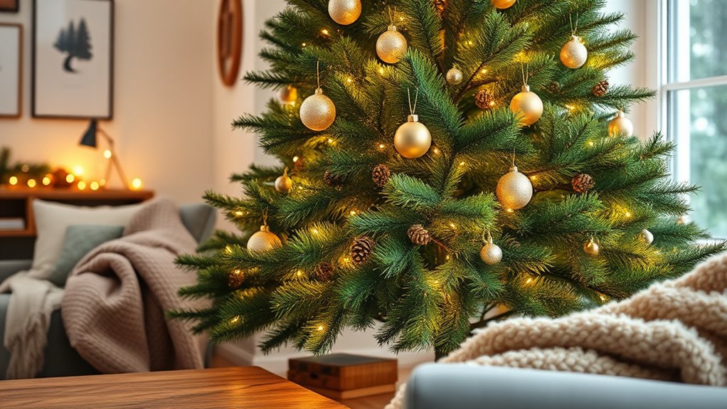A full and dense pre-lit Christmas tree instantly creates a lush, realistic look and provides ample space for ornaments. Trees with more tips—over 2,800—tend to be fuller and offer better coverage, enhancing their natural appearance. After assembly, fluffing and shaping the branches significantly boost fullness and help achieve a more realistic look. Layered PE and PVC tips contribute to increased density without adding weight, making the tree easier to manage. Properly distributed lighting and evenly spaced tips also play a vital role in creating a natural, full appearance, preventing sparse or uneven areas. When selecting a tree, focus on these factors to guarantee your holiday centerpiece looks vibrant, realistic, and ready for decoration.