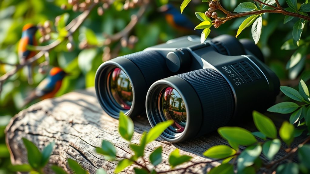 Imagine uncovering every vibrant detail in nature—that’s what premium binoculars deliver. The key to image clarity and color accuracy lies in high-quality lenses with multiple coatings that reduce glare and enhance light transmission. Edges should be sharp, and colors true to life. Look for models with high light transmission rates, excellent optical glass, and precise color correction. These features guarantee you see every bird in stunning detail, no matter the lighting.