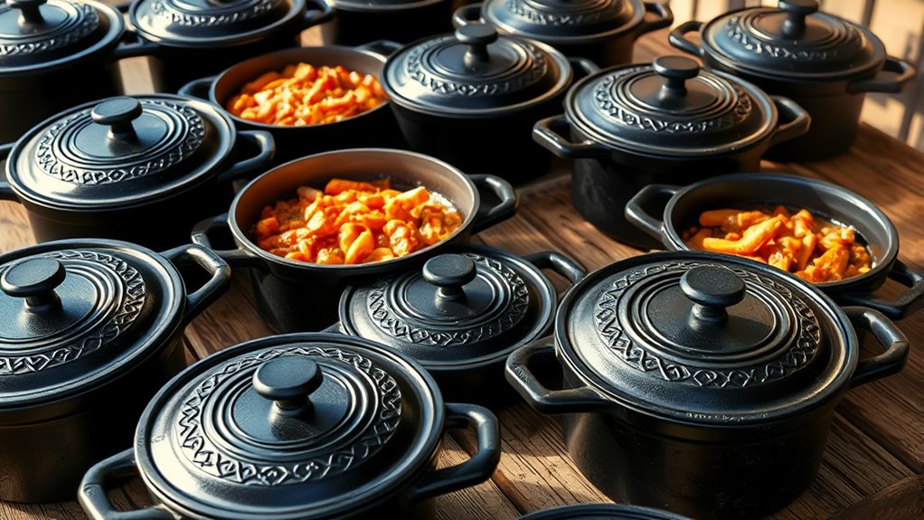 If you’re looking to elevate your cooking game, I recommend checking out the top 15 premium cast iron Dutch ovens. These models offer durable construction, excellent heat retention, and versatile performance for everything from braising to baking bread. With stylish finishes and easy maintenance, they’re a perfect addition to any kitchen. Want to discover which options stand out and how to choose the right one? Keep exploring to find the perfect fit for your culinary adventures.